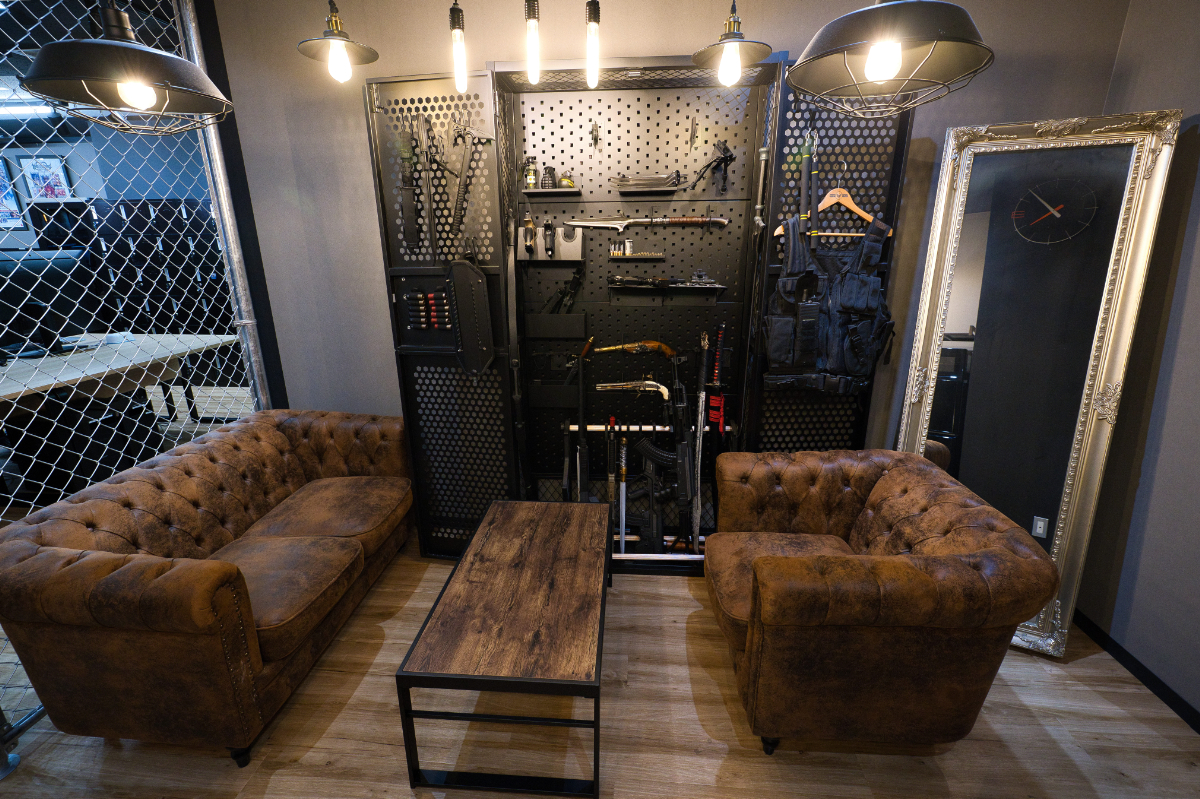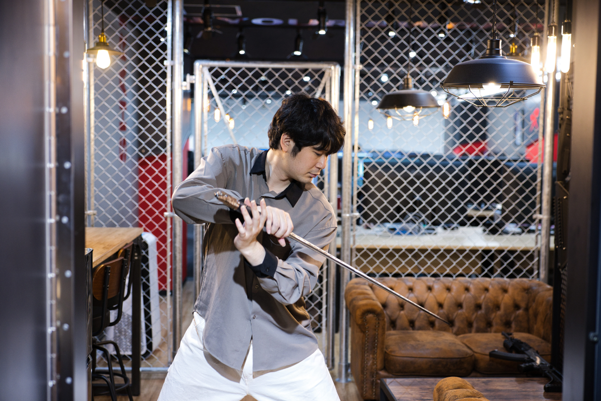 天井には「SHARPEN YOUR SWORD(お前の刀を研ぎ澄ませ)」の文字が書かれている。